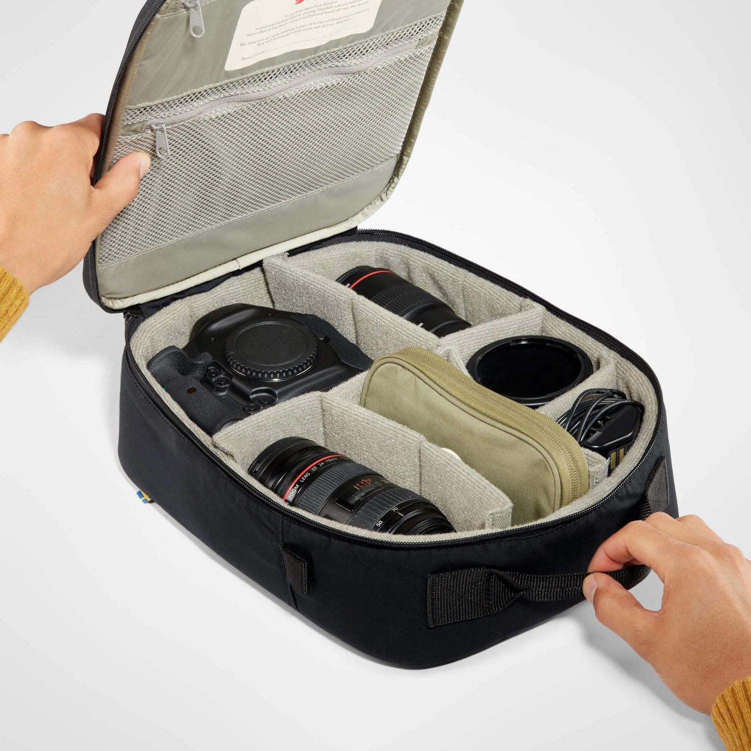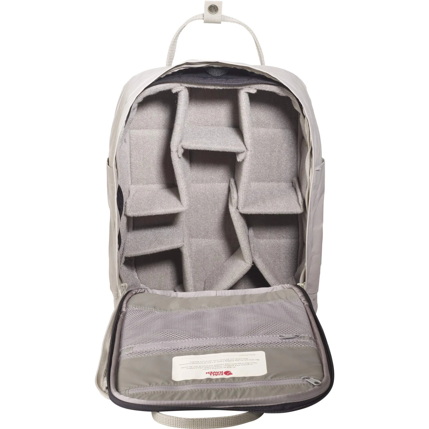 Das Kanken Photo Insert ist rundum gepolstert und mit robustem G-1000 HeavyDuty Eco S bezogen. Der gepolsterte Deckel des Einsatzes trägt innen zwei kleine RV-Netzfächer, die sich z. B. für Speicherkarten und weiteres Zubehör eignen. Im Inneren ermöglichen dir verstellbare Trenner eine individuelle Einteilung des Kanken Photo Insert.