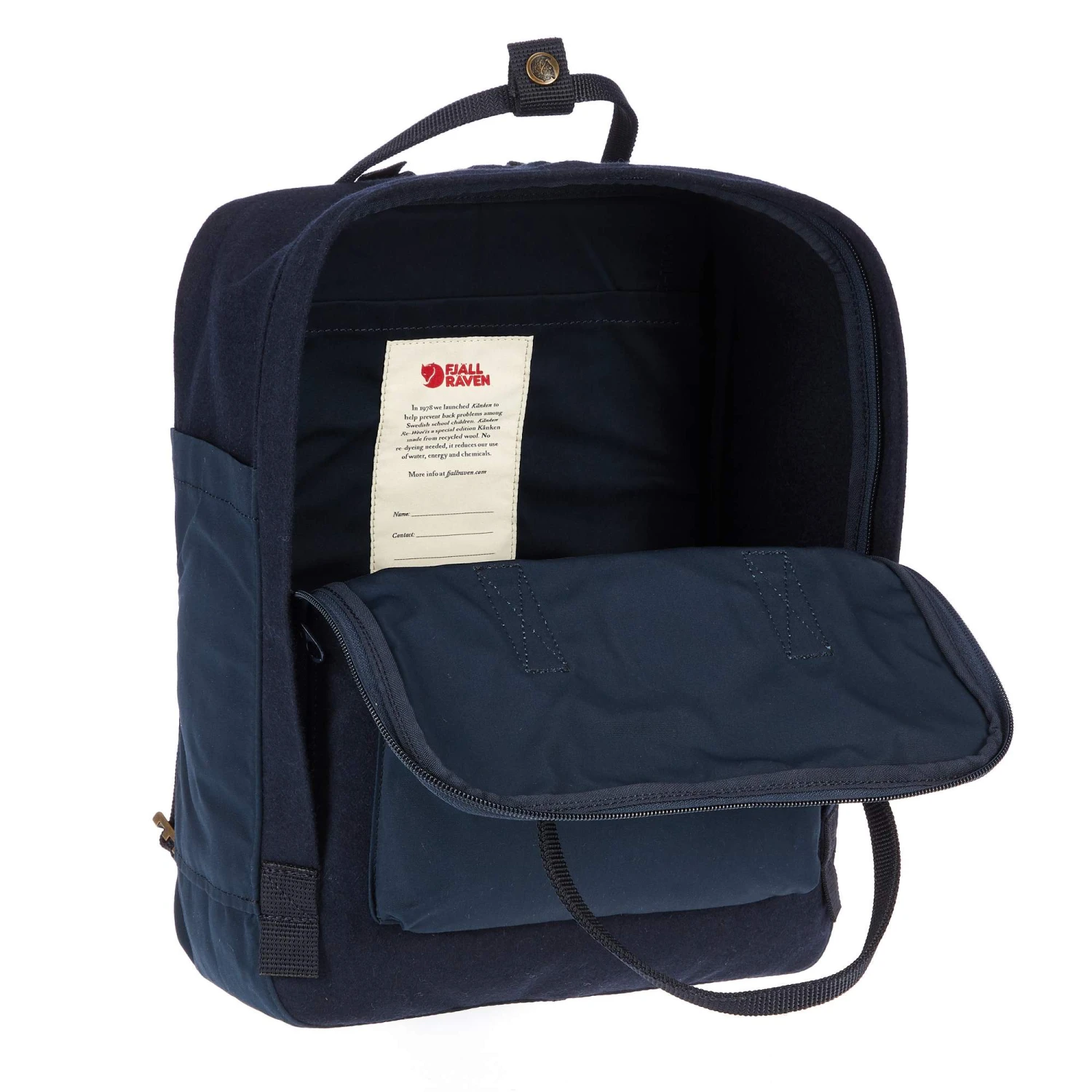 Der Kanken Re-Wool hat zwei seitliche Steckfächer, ein Namensschild innen und eine RV-Fronttasche. Die Schultergurte und die Handgriffe sind aus Gurtband gearbeitet. Ganz wie beim ursprünglichen Kanken.