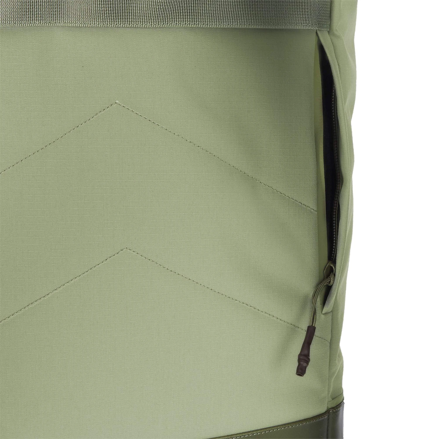 Denn sowohl das aus PET-Flaschen recycelte Außenmaterial, der mit Tarpaulin verstärkte Boden als auch die Reißverschlüsse sind stark wasserabweisend.