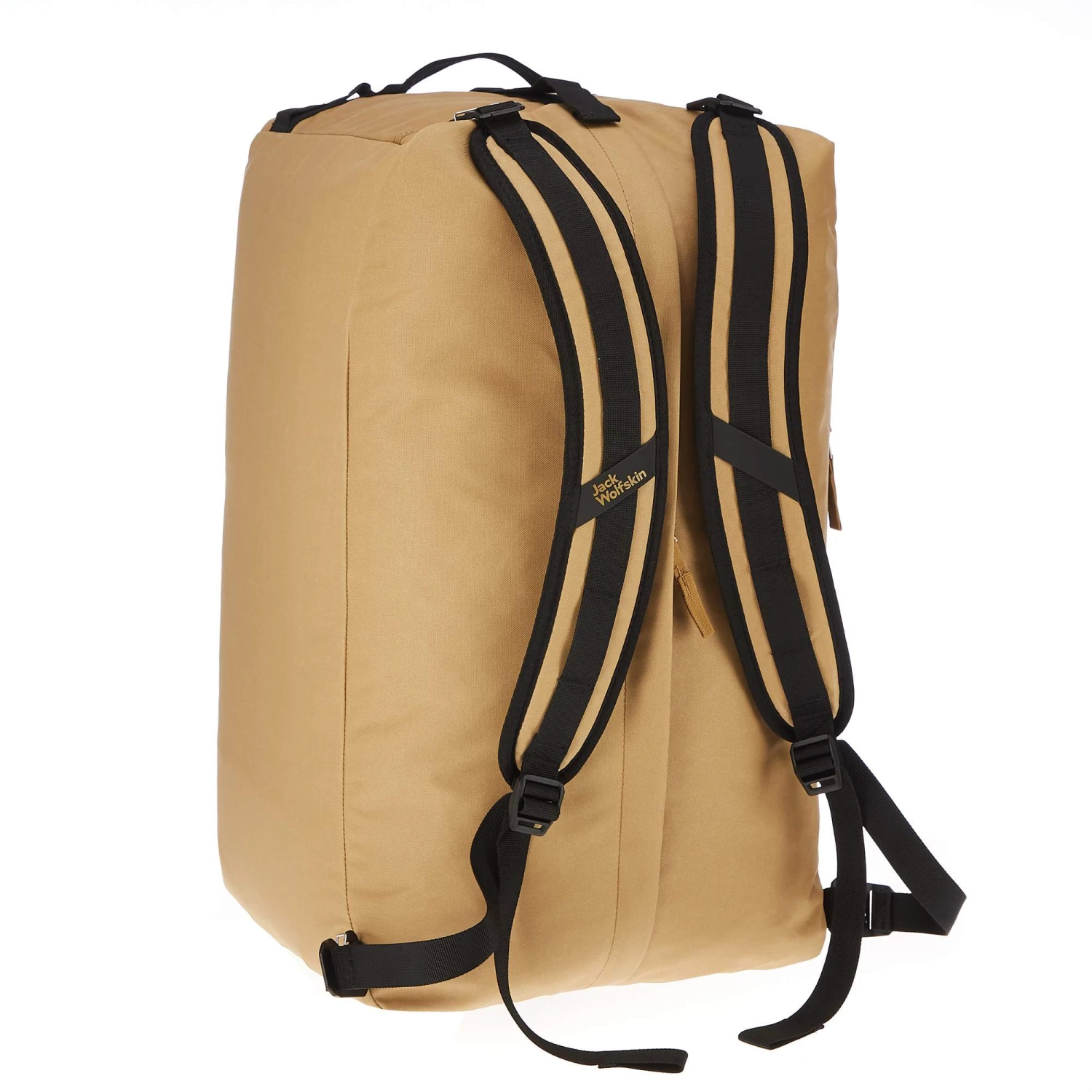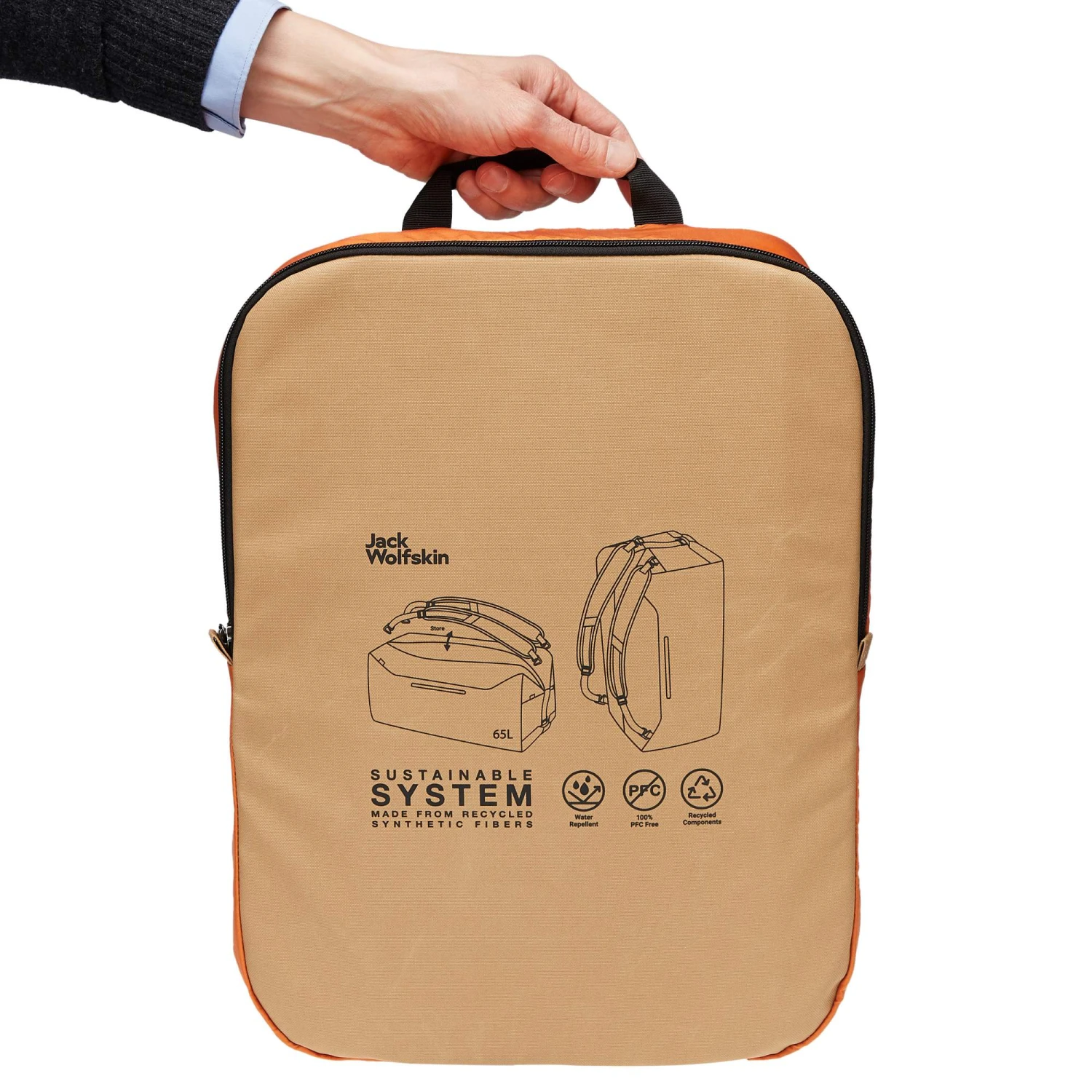 Die Traveltopia Duffle 65 überzeugt mit einer umweltbewussten, wachsartigen Beschichtung, die komplett ohne PFC und PVC auskommt. Gleichzeitig sorgt diese auch für einen lässigen Vintagelook.