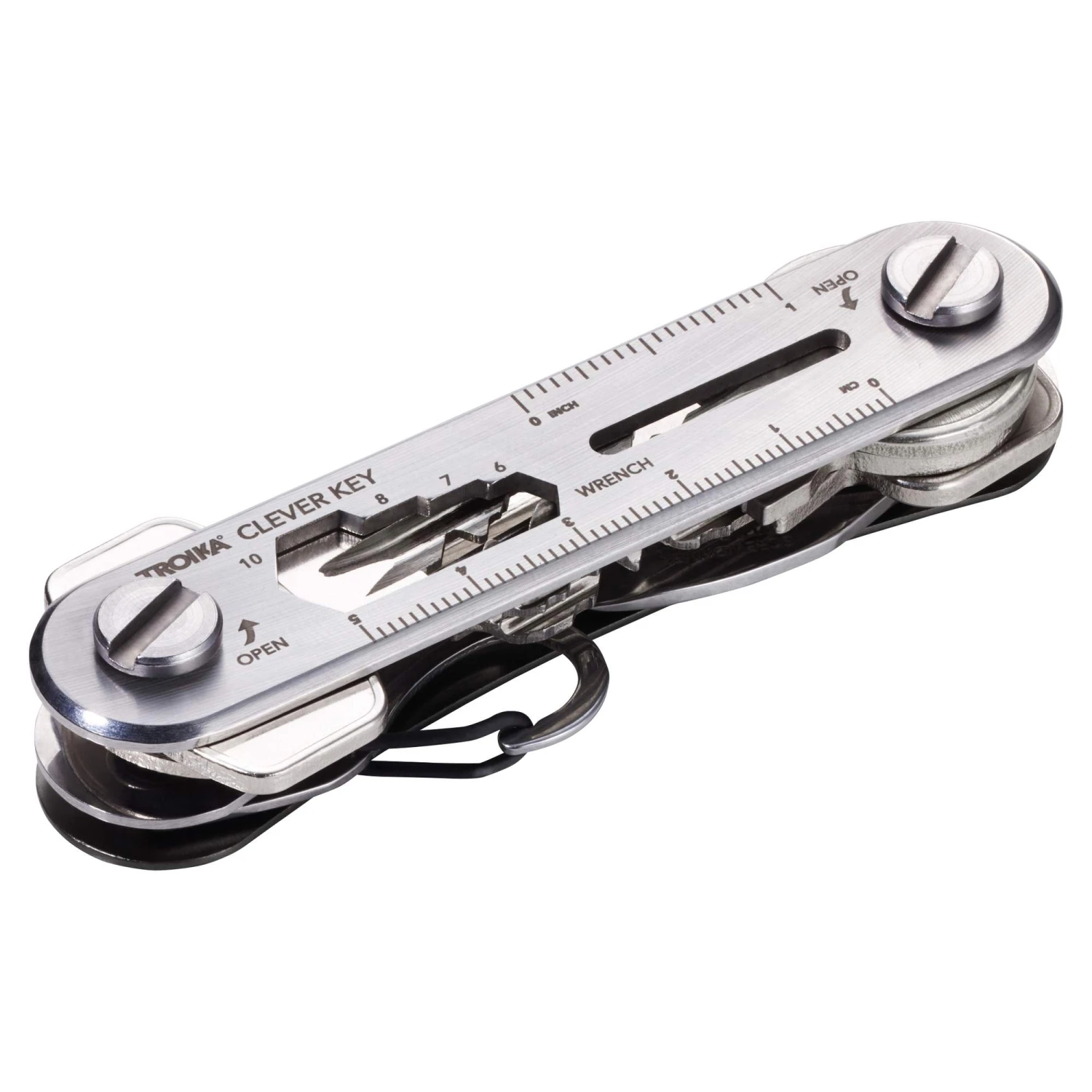 Die Schlüssel können wie ein Taschenmesser ausgeklappt werden und verschwinden bei Nichtgebrauch platzsparend in der Hosentasche. Die Befestigung ermöglicht ein klimperfreies Verstauen. Nebenbei sind sinnvolle Funktionen enthalten. Zum Lieferumfang gehört ein Schraubendreher mit Flaschenöffner-Funktion und ein Karabiner. Auf der Außenseite des Clever Key findest du einen Schraubenschlüssel (vier Größen) und ein Lineal.
