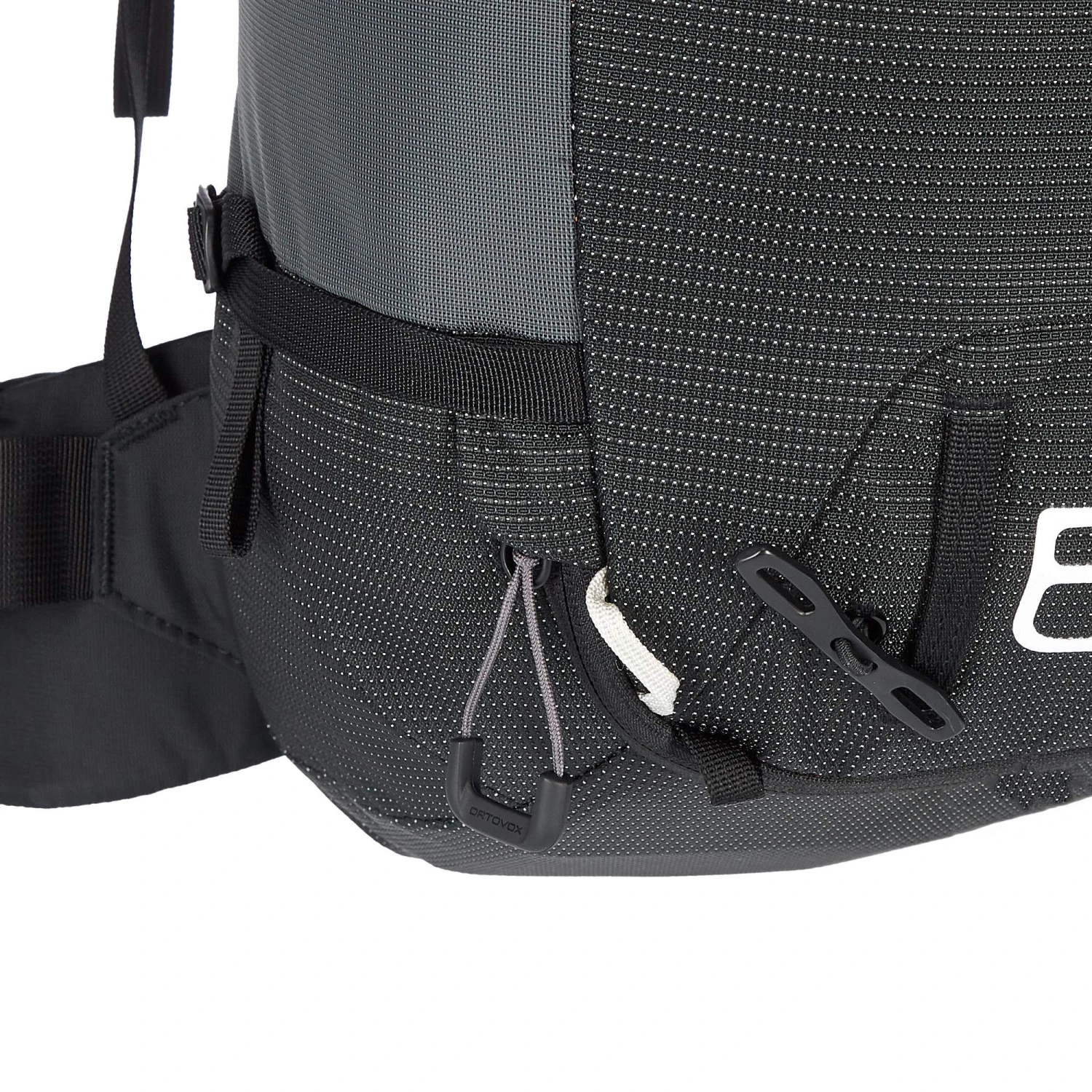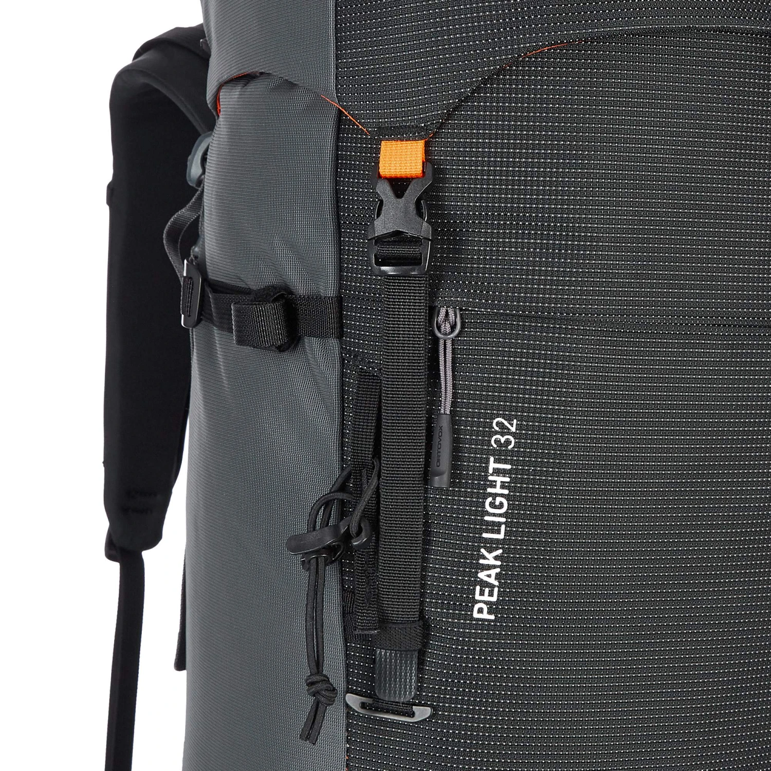 Der Peak Light 32 bietet Halterungen für Kletterseil, Skier, Eisgeräte, Trekkingstöcke und ein Helmnetz und ist damit vielseitig einsetzbar. Der Hüftgurt verfügt über eine Materialschlaufe, in die du Materialkarabiner schnell und griffbereit einhängen kannst. In die RV-Tasche auf der anderen Seite des Hüftgurts passen Kleinigkeiten oder Snacks.