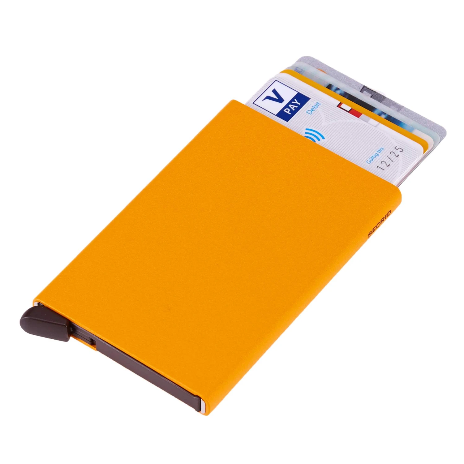 Das wichtigste jeder Secrid-Brieftasche ist der schützende, auslesesichere Cardprotector. Die Powder-Variante besteht aus pulverbeschichtetem Aluminium und einem farblich abgesetzten Hebelmechanismus.
