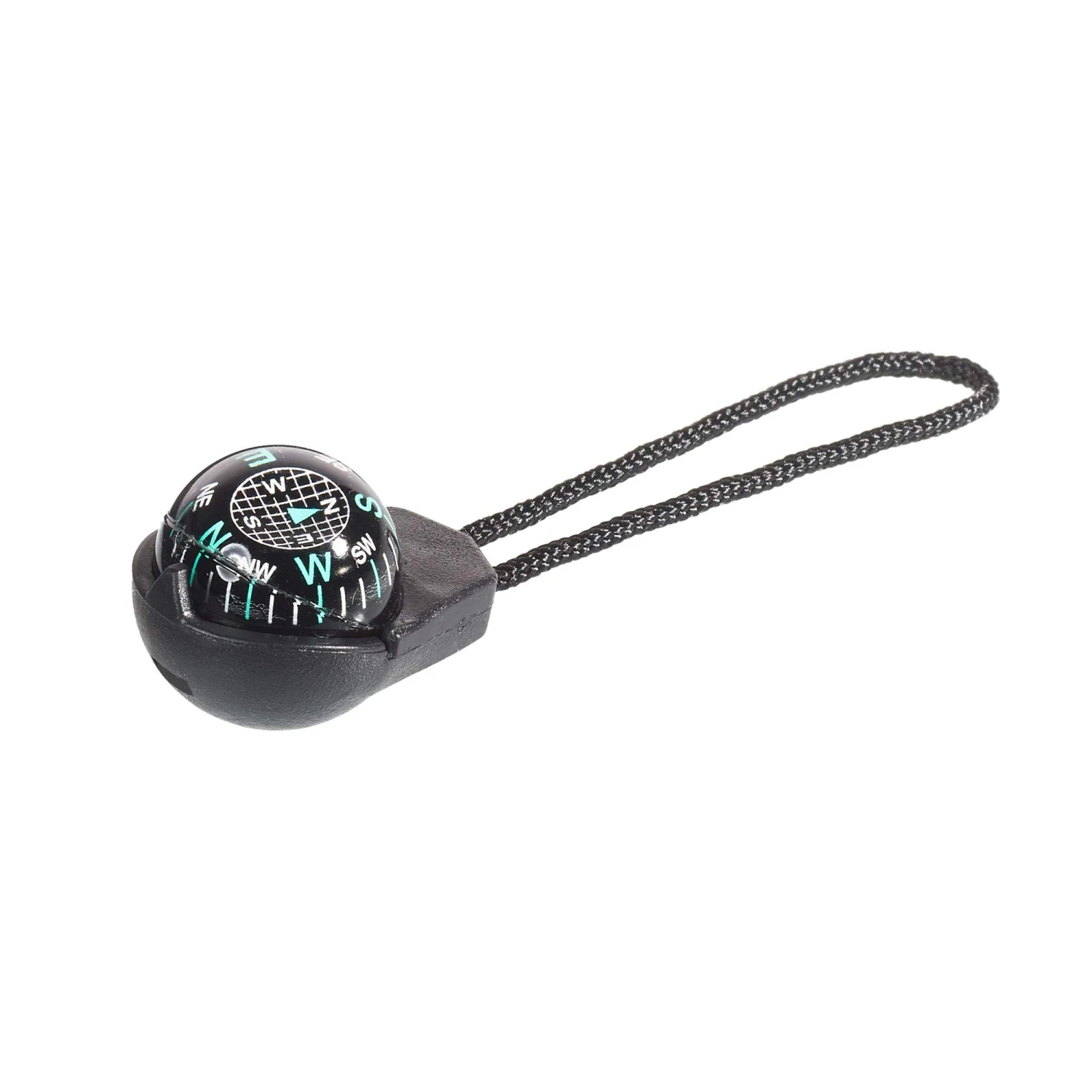 Das Gehäuse des Kompass‘ ist aus zähem ABS-Kunststoff. Mit der Schlaufe aus Nylon lässt sich der kugelige Kompass am Reißverschluss-Zipper oder anderen Gegenständen fixieren.